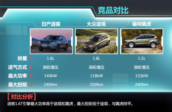 日产全新一代逍客搭载1.6T后,面临的首要竞争对手仍是大众途观、福特翼虎等车型,与这两款当前该细分市场中销量表现出色的车型相比,逍客1.6T动力较福特翼虎新增的1.5T EcoBoost发动机更为强劲,即便是在与大众途观1.8T发动机对比也并无较大差距,待新车推出之后,该车将凭借“高输出、低油耗”的优势对这两款车型发起冲击。