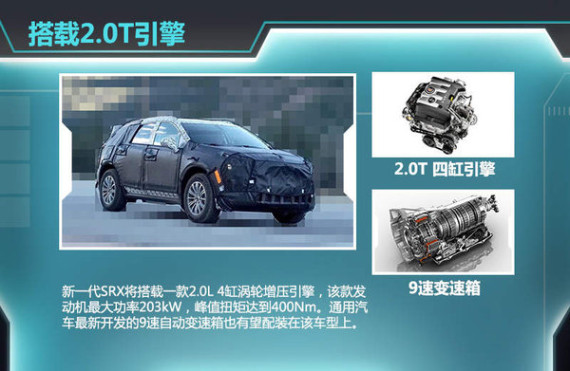 根据此前凯迪拉克公布的新车命名规则,SUV车型将采用XT加数字的命名方式,SRX换代车型推出后将纳入新命名体系,或将定名XT5,有望在2016年正式发布。动力方面,新一代SRX将搭载一款2.0L 4缸涡轮增压引擎,该款发动机最大功率203kW,峰值扭矩达到400Nm。通用汽车最新开发的9速自动变速箱也有望配装在该车型上。此外新车还将有两款功率不同的V6引擎可供选择。