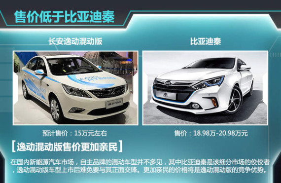 逸动是长安自主品牌旗下一款紧凑型轿车,2014年全年销售15.49万辆。今年3月6日,长安将逸动纯电动车正式推向市场,拉开了进军新能源汽车私人消费市场的战幕。按照长安新能源汽车发展规划,未来还将推出7款插电式混合动力产品。近日长安汽车股份有限公司副总裁刘波向媒体透露:逸动混动版将于明年上市。将成为7款混动产品中推出的首款产品,作为自主品牌中同样采用混动技术的车型,比亚迪秦在该细分市场风头正劲,逸动混动版上市后将与之竞争。