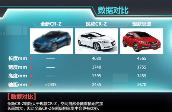 现款CR-Z车身尺寸分比为4080/1740/1395mm,轴距为2435mm,尺寸在当前A00级和A0级轿车之间,由于全新一代车型与新一代思域同平台打造,这也意味着该车的车身尺寸将会得以全面加大,轴距则较新一代思域将短100mm左右,从现款思域2670mm的轴距来看,全新CR-Z轴距长度有望达到2570mm,较飞度更长,这也促进的该车具有更大的内部空间。
