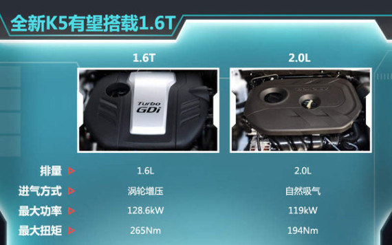 东风悦达起亚现款K5目前采用的是2.0L和2.0T两套动力总成,但在K4搭载1.6T后,苏南永表示:“往后推出的车型都会采用涡轮增压发动机,不仅在动力方面进行升级,同时在油耗方面也有一些改善”。其中1.6T引擎最大功率为128.6kW,峰值扭矩达到265Nm,动力输出高于2.0L,同时由于1.6T排量更小,凭借6.9L的百公里综合油耗在燃油经济性表现也更加突出,全新一代K5将有望采用1.6T引擎替代目前的2.0L。