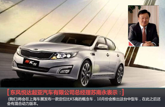 东风悦达起亚今年1-2月份累计销售超过10万辆,为完成75万台销售目标迈出了重要一步。随着KX3的推出,东风悦达起亚在保持较高增长的SUV市场拥有更为完善的产品序列,不过起亚并未局限于此,今年年内又将在轿车端进行布局。日前,东风悦达起亚总经理苏南永在与媒体沟通时表示:“ (我们)将会在4月份上海车展发布一款定位比K5高的中型概念车,10月份会推出量产车,在此之后还会有混合动力版本”。值得一提的是,媒体此前就获取了全新一代K5相关谍照,上海车展将发布的全新概念车有望是全新K5。