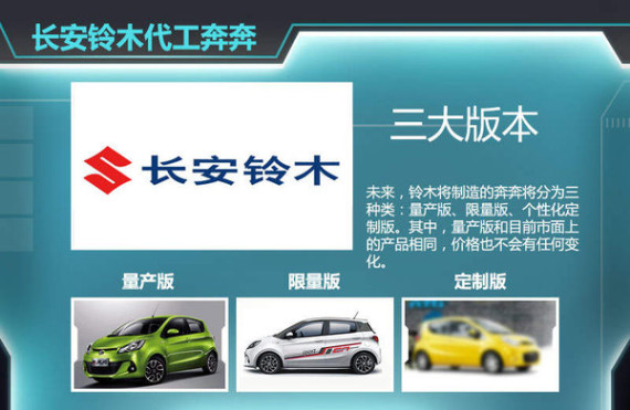 除了生产量产版车型,转由铃木制造的奔奔还将推出限量版和个性化定制版车型。目前,奔奔有三款限量版产品,配置和普通奔奔并无区别,只是在色彩搭配上进行了特殊处理。此外,长安还计划打造个性化定制版奔奔。消费者可根据自己的需求向厂家下单订购个性化的汽车,只需缴纳少量订金,就能通过长安的APP、官方网店和4S店订购个性车辆。这项服务预计在今年5、6月份开通。