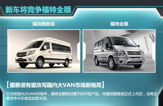 根据中国汽车工业协会发布的2014年商用车产销数据,轻型客车板块继续保持良好的上升势头,共计销售40.34万辆,同比增长14.84%。以商用车起家的福田汽车在与北汽“牵手”合资组建全新品牌“北汽福田”后,始终坚持深化商用车发展的主导方针。日前,媒体从北汽福田官方获悉:旗下首款大VAN(高端轻客)“图雅诺”将于4月21日开幕的上海国际车展中正式上市。待其入市后,主要竞争对手将会是欧系轻客领域中的王者福特全顺。