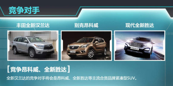 全新汉兰达的竞争对手将会是别克昂科威和现代全新胜达等主流合资品牌紧凑型SUV,如今紧凑型SUV细分市场硝烟四起,全新汉兰达若想获得较为理想的成绩,就一定要有合理的定价和车型配置,这决定着新车的竞争力。