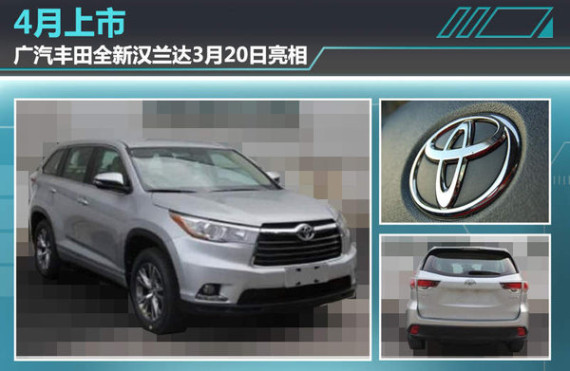 广汽丰田在今年1月份正式推出了全新一代凯美瑞,该车也是广汽丰田2015年新车布局的首款产品,值得一提的是,与凯美瑞同平台的SUV车型——汉兰达 (配置|询价)也将迎来换代车型。对于这两款重磅车型,广汽丰田执行副总经理李晖此前在接受媒体采访时表示:“通过这些产品能够带给客户和经销商新的期望,这也正是我们奋斗的目标。”近日,网通社从广汽丰田官方了解到,全新一代汉兰达将于3月20日率先发布,并将在4月份的上海车展中正式上市。