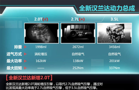 全新汉兰达将新增2.0T涡轮增压引擎,以取代现款汉兰达的2.7L自然吸气引擎,而3.5L自然吸气引擎将继续搭载。通过数据对比来看,2.0T涡轮增压引擎的动力输出介于2.0L和3.5L引擎之间,其162kW的最大功率相比于2.0L引擎来讲有很大提升,并且搭载2.0T涡轮增压引擎车型的消费税率也从12%下降至5%,下调了7个百分点,因此该车售价有望下调。