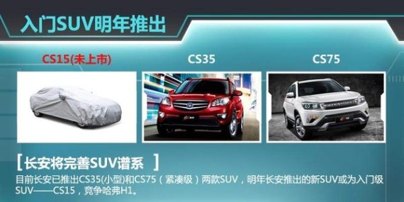 作为长安推出的首款SUV,CS35去年全年共销售10万辆,月均8000辆左右,年中上市的CS75全年也累计销售5.3万辆。随着产能的释放,进入2015年后这两款车销量飞速增长。数据显示,这两款SUV在今年前两月已贡献了5.4万销量。根据长安规划,明年还将有一款全新SUV上市,丰富SUV产品整容。据长安内部人士透露,该车是一款定位低于CS35的SUV,或命名为CS15。此外,长安明年还将推出一款全新的轿车产品。