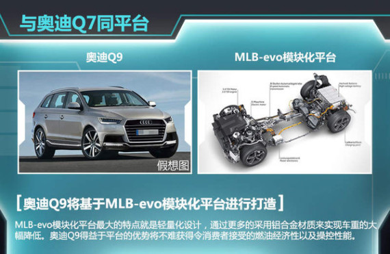 奥迪Q9将基于新一代Q7所采用的MLB-evo模块化平台进行打造,而这个平台也同样应用到了宾利SUV的研发。MLB-evo模块化平台最大的特点就是轻量化设计,通过更多的采用铝合金材质来实现车重的大幅降低。作为代表奥迪品牌新一代旗舰级产品并且定位于全尺寸豪华SUV,奥迪Q9很难摆脱在消费者眼中难操控和“油老虎”的第一形象。但是得益于平台的优势,该车将不难获得令消费者接受的燃油经济性以及令人满意的操控性能。