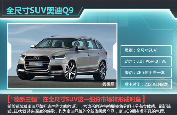 此外,根据奥迪品牌此前公布的计划,2020年之前,该品牌旗下的每一款车型都将推出e-tron版本,也就是说未来奥迪Q9也将推出插电混动版。由于全尺寸SUV的定位,奥迪有望为Q9 e-tron搭载3.0升6缸的汽油或柴油增压引擎+电动机的混动组合,进而在内燃机引擎的排量上与奥迪Q7 e-tron进行区分。
