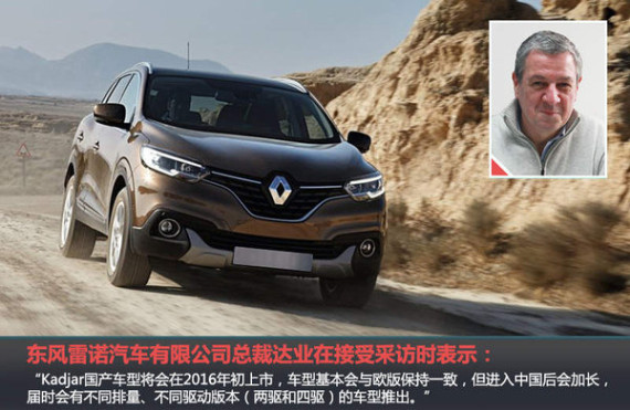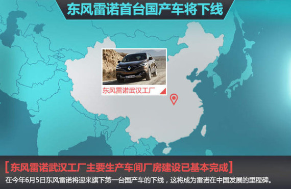 雷诺品牌在2014年完成了271万辆的全球销量,而中国市场仅占其中的3.4万辆。由于进入中国市场较晚,雷诺品牌在国内市场的认知度还有待提高。目前雷诺正通过建设新工厂以实现新车型的在华投产,进而加码中国市场,以抢占更多的市场份额。近日,网通社从东风汽车公司官方了解到,东风雷诺第一台国产车型预计在今年6月5日即可下线。对于首款车型,东风雷诺汽车有限公司总裁达业先生此前向网通社表示:“Kadjar国产车型将会在2016年初上市,车型基本会与欧版保持一致,但进入中国后会加长。”该车将以东风雷诺首款国产车型的身份在2016年初正式投放市场。