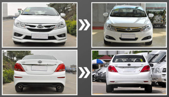 首先需要指出,上图中左侧部分为即将上市的新款比亚迪速锐。相比于右侧的现款车型,其变化集中在车头处:大尺寸镀铬装饰材质的中网很抢眼,保险杠造型更加大胆,类似X造型动感十足,其中LED日行灯的加入使该车时尚感激增。与此同时,车身侧面和尾部的改动不太明显,最大变化是在后保险杠处添加黑色包围,并将两侧反光板上移。此外,新车的排气孔还由单边单出调整为双边双出,这一改动给整个尾部造型运动感提升不少。