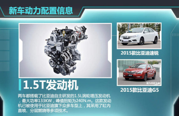 动力方面,两车都搭载了比亚迪自主研发的1.5L涡轮增压发动机,最大功率133KW,峰值扭矩为240N.m。据悉,这款采用缸内直喷、分层燃烧等多项技术的发动机目前已被使用在比亚迪旗下众多车型上,经过多年的市场检验,其可靠性值得信任。与发动机相匹配的传动系统是6DCT双离合变速箱,此套总成有着动力足,油耗低等特点。另外,比亚迪速锐还有一款1.5L自然吸气发动机供消费者选择。