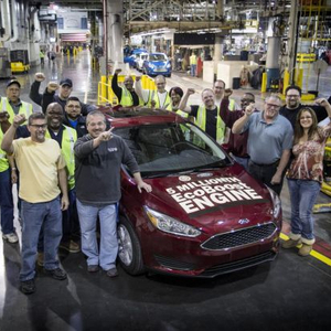 这辆在福特动力史上具有特殊意义的车型为一款红色福克斯,当其徐徐从成产线开出的时候,全场工人与其合影留念。