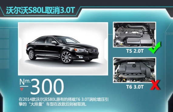 由于临近停产且只是年度改款,2015款沃尔沃S80L在外观方面无任何改变。在内饰方面,新车也仅是在老款车型的基础上,增加了“Volvo On Calll”随车管家(含3年服务),并配备了8喇叭高级音响系统。在动力方面,2015款沃尔沃S80L仅搭载一台T5 2.0T涡轮增压发动机,其最大输出功率为157kW/6000rpm,峰值扭矩为300Nm/2700-5000rpm,与发动机匹配的是6速手自一体变速箱。而此前在2014款沃尔沃S80L原有的搭载T6 3.0T涡轮增压引擎的“大排量”车型在改款后则被取消。