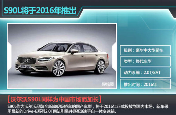 S90L作为沃尔沃品牌全新旗舰级轿车的国产车型,将于2016年正式投放到国内市场。新车动力总成采用最新的Drive-E系列2.0T四缸引擎并匹配8速手自一体变速箱,先进的引擎在提供强劲动力的同时油耗将得到明显降低。目前在国内豪华中大型车这一细分市场当中,宝马5系Li和奥迪A6L这两款较为畅销的车型均在原型车基础上专门针对中国市场进行了加长。沃尔沃S90L同样为中国市场而加长,这款开启了豪华品牌旗舰车型“中国制造”先河的产品将会有怎样的市场表现,相信有很多消费者都在期待它的上市。(网通社 2015年3月19日 北京报道)相关文章阅读:·沃尔沃在华推2手车业务 网点将大幅扩张2015-03-13·沃尔沃将携手58等多家电商 推二手车业务2015-03-10·沃尔沃S90将加长国产 搭双增压2.0T引擎2015-03-03