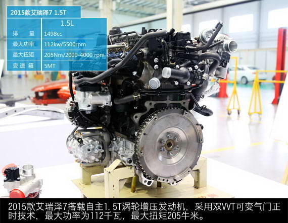 本次2015款艾瑞泽7上市的最大亮点在于搭载了涡轮增压发动机。这款型号为E4T15的发动机,采用双独立控制可变气门正时系统和增压中冷技术,没有采用缸内直喷,而是多点喷射的供油方式,最大功率为112千瓦,最大扭矩205牛米,可在1500转每分时输出90%的最大扭矩,在同排量账面数据的表现上有一定优势。与这台发动机匹配的是一款5速手动变速箱,这款变速箱的内置换挡机构由舍弗勒提供。