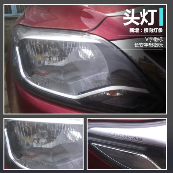 新款悦翔V3整体外观延续了现款车型的造型设计,在细节处有诸多改动。前脸采用长安最新家族式设计风格,上进气格栅为黑色双格栅设计,并采用镀铬饰条勾勒轮廓,“v”形徽标镶嵌其上,使整体造型风格视觉上更加动感,并与现款车型有明显区别。头灯组造型设计更加时尚,在光源部分增加了“V”字徽标,头灯组侧面新增了长安字母标致,内部加装了横向灯条,点亮后有更出色的视觉效果。此外新车引擎盖还增加了防水胶条,实用性能进一步提升。