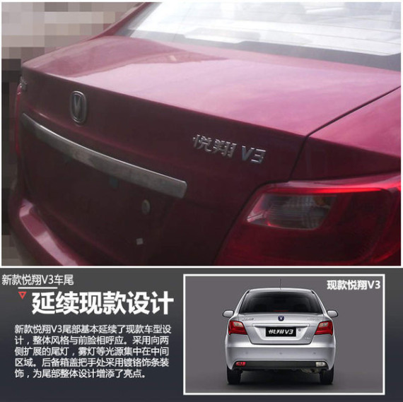 新款悦翔V3尾部基本延续了现款车型设计,整体风格与前脸相呼应。采用向两侧扩展的尾灯,雾灯等光源集中在中间区域。后备箱盖把手处采用镀铬饰条装饰,为尾部整体设计增添了亮点。此外长安汽车、悦翔V3等徽标分列尾箱两侧,整体布局与现款车型一致。