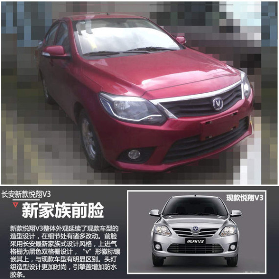 悦翔V3是长安旗下一款小型三厢轿车,于2012年6月正式上市,与悦翔V5、悦翔V7组成长安悦翔系列车型从低到高的产品布局。按照长安汽车规划,今年将主要对旗下成熟产品进行优化,悦翔V3将迎来改观车型,新车将于年内正式上市。从谍照图来看,新车主要对前脸格栅、头灯组及内饰等部分进行了调整,未来上市后仍将与吉利金刚等车型抢占市场份额。
