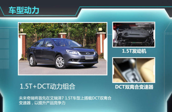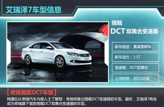 奇瑞最早提出DCT车型概念是在2013年上海车展前夕,奇瑞对外发布了“iAuto核心技术概念平台”,该平台由Cloudrive(智云娱乐新车系统)、ACTECO(智效动力总成系统)、Cherisma(智衡整车精益标准)三大部分组成。其中在动力总成方面,奇瑞将陆续推出自主研发的CVT、DCT以及8AT等多款变速箱,如今CVT已经被大量的应用在了奇瑞旗下的车型上,包括艾瑞泽7、瑞虎5等。随着技术的逐渐成熟,DCT技术也将被广泛应用到奇瑞旗下各款车型上,首推的将是艾瑞泽7 1.5T车型。