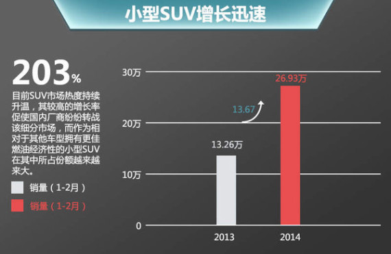 目前SUV市场热度持续升温,其较高的增长率促使国内厂商纷纷转战该细分市场,而作为相对于其他车型拥有更佳燃油经济性的小型SUV来讲在其中所占份额越来越来大,SUV小型化的趋势愈加明显。今年前两月,国内小型SUV累计销量为26.93万辆,较去年同期猛增203%,在SUV市场内占比已达33%。巨大的市场潜力,较高的增长率是此次绅宝品牌推出绅宝X25的初衷所在。