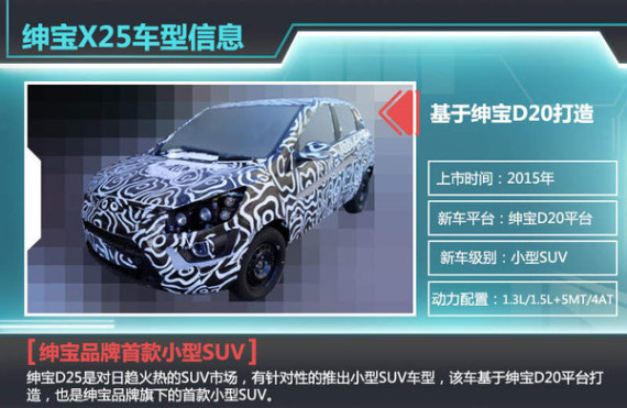 在自主阵营遭遇市场占有率十二连降的低迷态势下,北京汽车自主品牌逆市上扬,全年共销售新车30.96万辆,同比增长53%。如此佳绩主要归功于旗下绅宝品牌车型的畅销,为继续扩大优势,包括绅宝X65在内的旗下3款SUV车型将陆续上市。日前,媒体从北汽集团官方获悉:继绅宝X65之后,2015年内还将推出绅宝X55、绅宝X25等两款全新SUV车型,值得一提的是绅宝X25专门针对现阶段火热的小型SUV市场推出的全新车型。