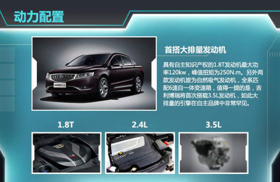 既然被称之为具有划时代意义的车型,吉利博瑞“芯”也定与之前不同,动力方面,吉利博瑞提供三款不同动力引擎,其中主推具有自主知识产权的1.8T发动机最大功率120kw,峰值扭矩为250N.m。其它两款皆为自然吸气发动机,全系匹配6速自一体变速箱。值得一提的是,吉利博瑞将首次搭载3.5L发动机,如此大排量的引擎在自主品牌中非常罕见。澎湃的动力是吉利博瑞又一大亮点所在,这也是推动吉利汽车走向另一个巅峰的助力。