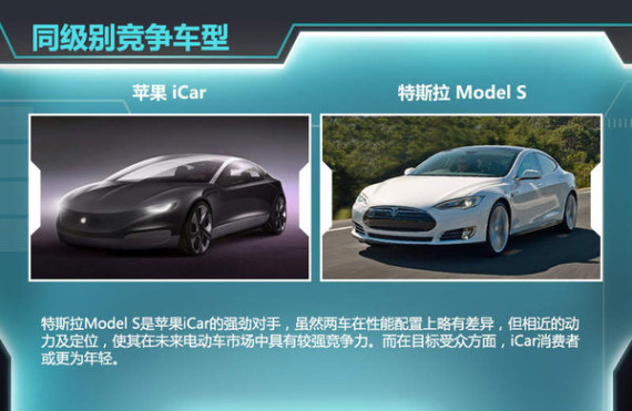 纵观进口高端电动车行列,入门版的特斯拉Model S无疑是苹果iCar的强劲对手,虽然两车在性能配置上略有差异,但相近的动力及定位,使其在未来电动车市场中具有较强竞争力,而在目标受众方面,iCar消费者或更为年轻。