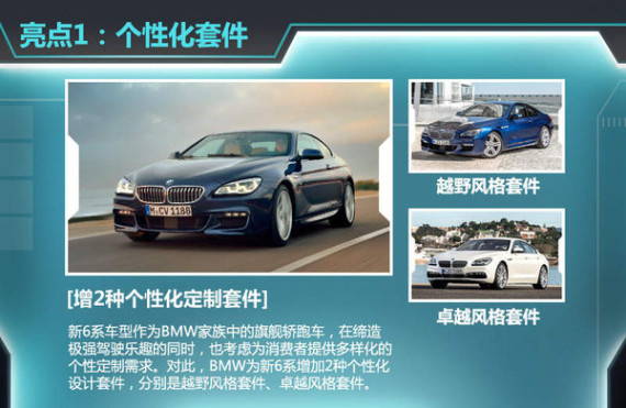 新6系车型作为BMW家族中的旗舰轿跑车,在缔造极强驾驶乐趣的同时,也考虑为消费者提供多样化的个性定制需求。对此,BMW为新6系增加2种个性化设计套件,分别是越野风格套件、卓越风格套件。从而使车辆的外观造型更加动感,内饰氛围更为奢华。