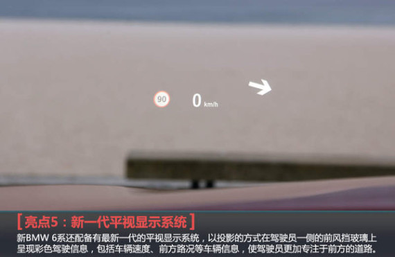 新BMW 6系还配备有最新一代的平视显示系统,以投影的方式在驾驶员一侧的前风挡玻璃上呈现彩色驾驶信息,包括车辆速度、前方路况、车道建议、速度限制、娱乐信息等诸多车辆信息,从而使驾驶员更加专注于前方的道路,有效提升驾驶安全性。