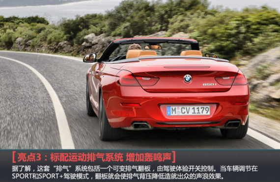 为使新BMW 6系更具吸引力,新车全系标配了可控阀门的运动排气系统,增加发动机的轰鸣声,令新BMW 6系轿跑车成为路人眼光中的焦点。据了解,这套“排气”系统包括一个可变排气翻板,由驾驶体验开关控制。当车辆调节在SPORT和SPORT+驾驶模式,翻板就会使排气背压降低造就出众的声浪效果。