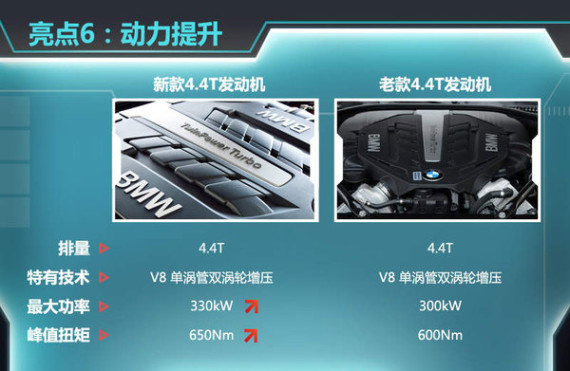 此次发布的新6系车型另一大变化,便是动力性能进一步提升。其中搭载4.4T双涡轮增压发动机,采用单涡管双涡轮的形式,最大功率为330kW/5500-6000rpm,峰值扭矩为650Nm/2000-4500rpm。相比现款4.4T发动机最大功率和峰值扭矩,分别增加30kW和50Nm,实现动力的全面优化。