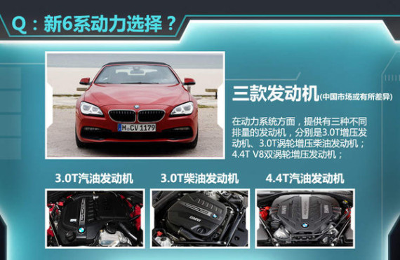中期改款的新BMW 6系,旗舰车型搭载一台4.4T双涡轮增压发动机,针对中国市场这款发动机或将进行相应的调整。对此,BMW品牌研发团队高层表示:“针对不同全球市场的排放标准和消费税率,我们会进行一定的调整。”目前国内在售的6系车型所搭载是4.0T的双涡轮增压发动机,年底新6系入华后相信旗舰发动机的排量会进行一定的调整。