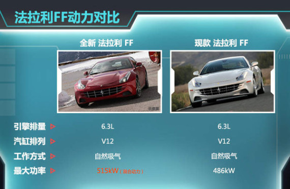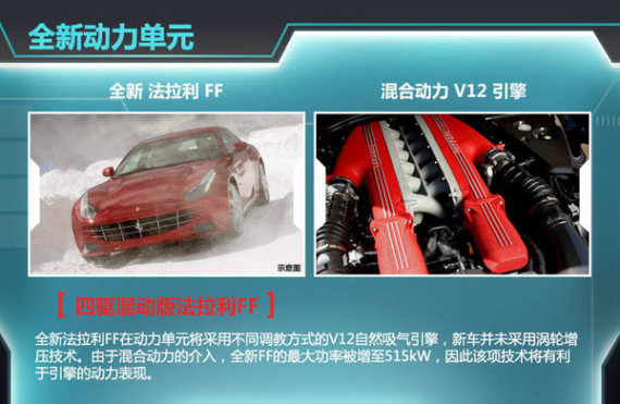 全新法拉利FF在动力单元将采用全新调教的自然吸气引擎,并未采用其最新换代的超跑车型所搭载的涡轮增压技术。由于混动系统的介入,全新FF的最大功率被增至515kW,使该款6.3L引擎的动力表现明显提升。