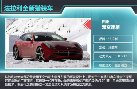对于一家将赛车理念下探到民用车款的厂商而言,其最新一代法拉利FF在秉承赛车化运动血统的基础上融入了贵族的典雅风度,在动力单元将继续使用现阶段的V12引擎,虽然新车未采用涡轮增压技术,但以一套混合动力系统作为其辅助动力来源。