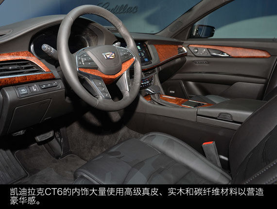 凯迪拉克CT6的内饰大量使用高级真皮、实木和碳纤维材料以营造豪华感,中控台上还配备了大尺寸高分辨率液晶触摸屏,而后排乘客则备有信息娱乐系统。前排真皮座椅除了带有加热功能还提供五种模式的按摩功能,后排电动调节座椅能够调整到半躺姿势,多媒体信息娱乐系统通过后排扶手上的面板进行控制。