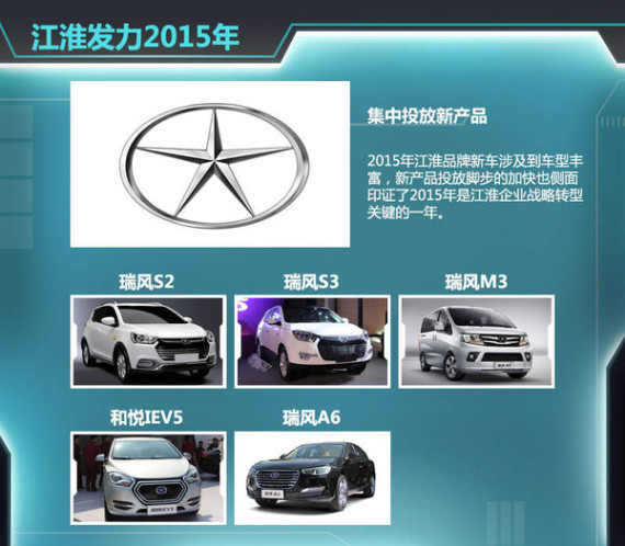 江淮旗下重磅MPV车型瑞风M3于3月18日上市,同时第二代瑞风S5也正式上市,根据企业规划,小型SUV瑞风S2有望于8月左右面向市场。除此之外,IEV5和瑞风A6都将于年内推出,以上表明2015年江淮品牌新车涉及到车型丰富,新产品投放脚步的加快也侧面印证了2015年是江淮企业战略转型关键的一年。