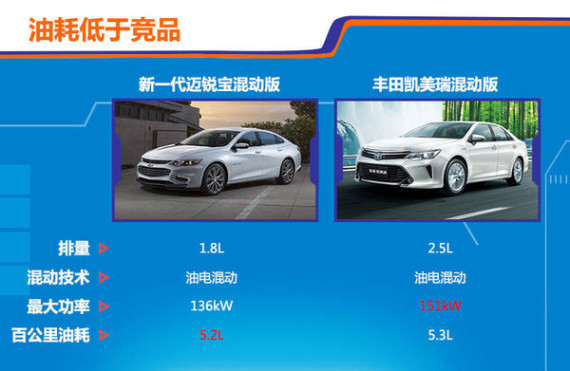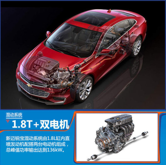 除了传统动力外,雪佛兰还为迈锐宝准备了一套混合动力系统。该系统使用1.8L缸内直喷直列四缸发动机配搭两台电动机,整套系统的峰值功率输出达到136kW。配备容量为1.5kWh的锂离子电池组,纯电动模式下的极速达到88km/h。这套混合动力系统还配有制动能量回收系统,以及被称为EGHR的排气温度回收系统,EGHR被用于发动机预热和座舱制热。新车混动系统的百公里综合油耗为5.2L,比已上市的丰田凯美瑞混动车型油耗略低,但最大功率低于对手。