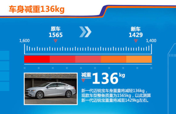 新一代迈锐宝使用通用最新的E2XX平台打造,它是Epsilon平台的改良版,也是通用的四个核心平台之一。未来别克君威、君越、新一代欧宝Insignia等车型也将使用E2XX平台。得益于新平台优势,新一代迈锐宝车身重量将减轻136kg,现款车型整备质量为1565kg,以此测算新一代迈锐宝重量将减至1429kg左右,减幅达到8%,将为整车提供更出色的操控性能及燃油经济性。