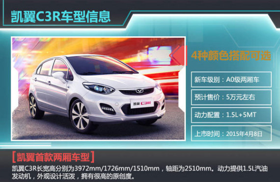 作为凯翼旗下首款两厢车型,凯翼在其做工装备上下足了功夫。但是作为后来着的凯翼C3R在品牌影响力等方面还有所欠缺,所以亲民的售价将会带来在一定程度上弥补。目前雪佛兰赛欧两厢版、马自达2的售价集中在6到8万之间,近期上市的凯翼C3R如果能够定一个较为合理价格,将会为其带来更强的市场竞争力。(网通社 2015年4月4日 北京报道)相关文章阅读:·凯翼首款SUV年底上市 将与奇瑞共线生产2015-02-04·凯翼将产SUV等6款新车 目标年销40万辆2014-08-07·凯翼8月28日发布 SUV及轿车将同时亮相2014-08-06