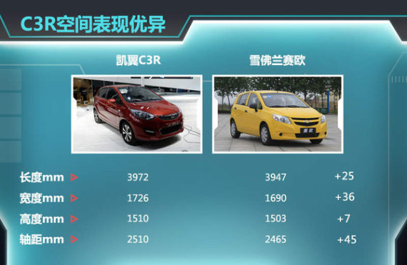 凯翼C3R作为一款A0级车,在空间上有着不错的表现。其车长宽高分别为3972mm/1726mm/1510mm,轴距为2510mm,拥有同级别车中最长的车身上尺寸。而在轴距上比同级别的雪佛兰赛欧两厢版长了45mm,也达到了同级车中最好的空间表现。