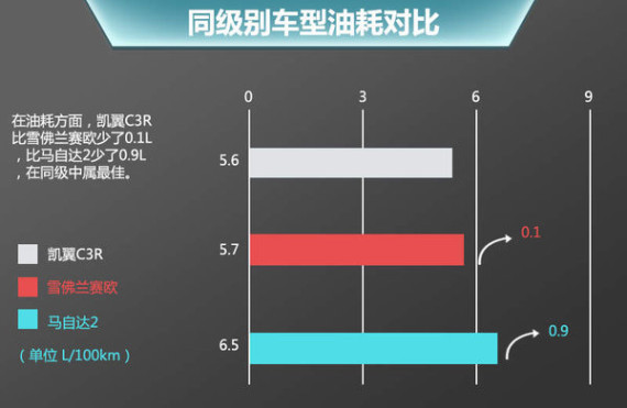即将推出的凯翼C3R是目前在售凯翼C3车型的两厢版,不仅在外观造型和内饰工艺上进行了优化,同时在加速性能和燃油经济性上也实现了全面升级。,凯翼C3R在经过对油门踏板、ECU数据、空调启停等优化措施后,其百公里综合油耗为5.6L。相比于雪佛兰赛欧两厢的5.7L/100km和马自达2的6.5/100km,凯翼在油耗方面略胜对手。