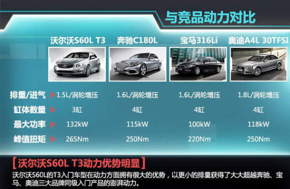 在国内豪华车市场中,车辆呈现出“小排量、增压化”的发展趋势,尤其在中级车细分市场中,奔驰、宝马等各大品牌均推出了搭载1.6T引擎的入门车型。而随着沃尔沃三缸技术的日趋完善,S60L在使用这台发动机后,将使得豪华中级车市场竞争更加白日化。而这款发动机在对比宝马与奔驰搭载的1.6T引擎后,我们发现在动力方面沃尔沃三缸引擎更具优势,同时其5.9L的油耗也帮助沃尔沃S60L拥有更好的性价比。