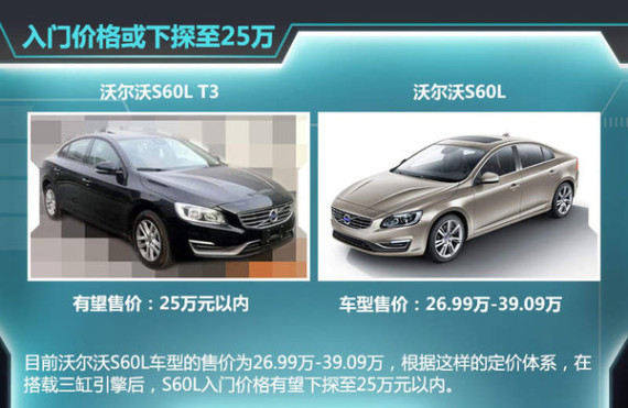 沃尔沃S60L T3入门车型将搭载的全新三缸1.5T引擎重量仅99千克,相比传统的四缸与六缸发动机,三缸引擎拥有更轻的重量和更小的体积。如此的改变在保证足够动力的同时,将为新车带来更好的燃油经济性,随之而来的将是前期税率和后期燃油消费等多种费用的降低。由此对新车售价进行估计,现款S60L入门车型26.99万元的官方起售价格估计,在搭载三缸1.5T引擎的T3车型推出后,沃尔沃S60L的入门价格有望降低到25万元左右。