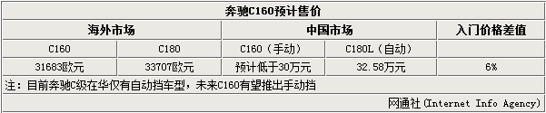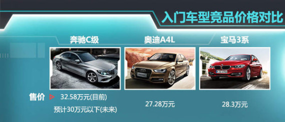 根据目前奔驰全新C级在华32.58万的入门售价,相比奥迪A4L和宝马3系分别为27.28和28.3万元的入门售价而言明显高于竞争对手。而未来C160车型推出后,则将与竞品入门售价接近。于此同时目前上述两款竞品的入门车型均为手动版本,因此未来奔驰C级 (配置|询价)也有望推出手动版车型。