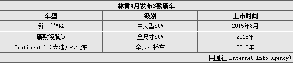 按照林肯在华发展规划,将在2016年前在华引入5款新车,其中紧凑型SUV——MKC和中型轿车MKZ已于去年10月底在国内正式上市。据悉,在4月份的上海车展期间林肯将发布3款新车,分别为中大型SUV——MKX、旗舰SUV新款领航员和全尺寸轿车Continental(大陆)概念车,其中MKX有望于今年8月正式在国内上市,新款领航员也将在年内上市,大陆量产车型将在明年入华销售。