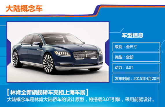 林肯自去年重返中国市场以来已推出MKZ和MKC两款车型,今年将继续扩充旗下产品谱系,提升在国内豪华车市场的竞争力。林肯中国区总裁庞立博(Robert Parker)透露,除了MKZ和MKC,2015年林肯会引进MKX和新领航员,2016年还将推出一款全尺寸轿车。近日,林肯官方透露,林肯将在4月20日开幕的上海车展上发布3款新车型,其中包括林肯近期推出的全新旗舰轿车——Continental(大陆)概念车,该车型的量产版将于明年入华销售。