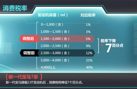 现款宝马7系入门版搭载一台3.0T涡轮增压引擎,在车价当中税率部分包括了12%的消费税 、17%的增值税以及针对进口车的25%关税。其中增值税和针对进口车的关税相对固定,因此消费税在车辆价值中的影响因素更为重要。“消费税”由生产企业或是进口汽车企业向税务机关缴纳,但最终会体现在车价当中。
