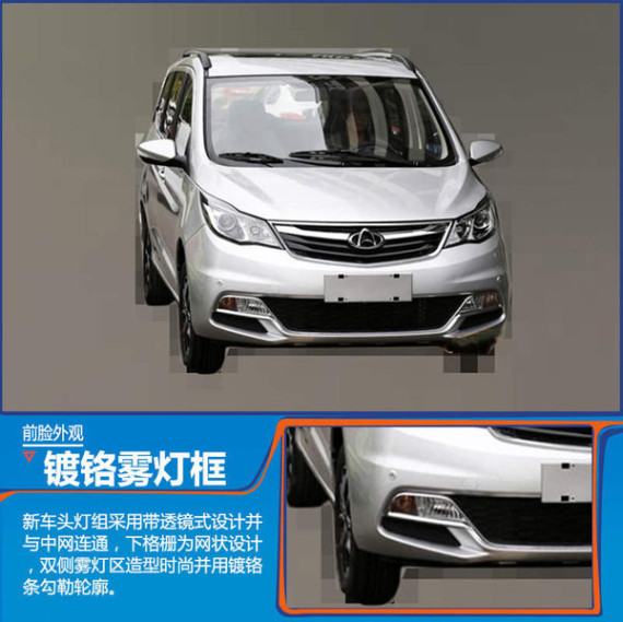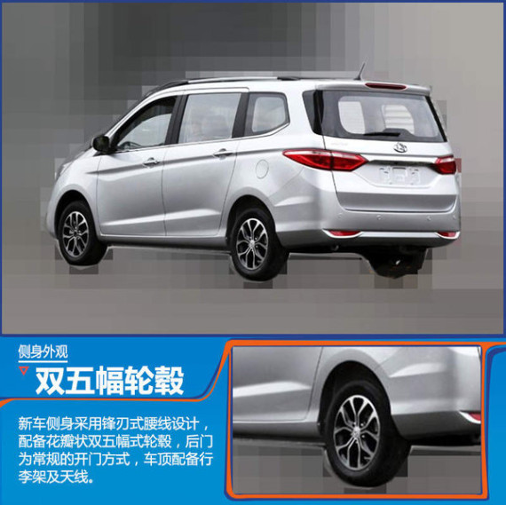 车身方面,新车侧面采用了双腰线的设计,其车身上部腰线采用“锋刃”造型,并延伸至尾部与尾灯相连,营造出较强的车身整体感。车窗下边缘采用了镀铬条装饰,提升了视觉上的高档感,新车后门并未采用传统MPV侧滑门式的设计,为车型增添了些许新鲜感。新车配备“花瓣状”双五幅式轮毂,车顶配备行李架及天线,使整车更显时尚感。